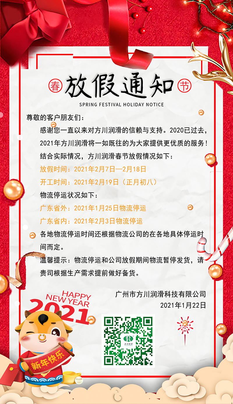 2021年春節(jié)將至,方川潤(rùn)滑預(yù)祝您春節(jié)快樂(lè)。公司定于2021年2月7日至2021年2月18日放假,假期12天。放假期間暫停發(fā)貨,請(qǐng)各位客戶朋友提前做好備貨準(zhǔn)備。