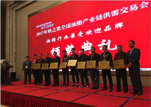 徐立庶總經(jīng)理作為頒獎(jiǎng)嘉賓向獲得“油脂行業(yè)最受歡迎品牌”的企業(yè)頒獎(jiǎng)
