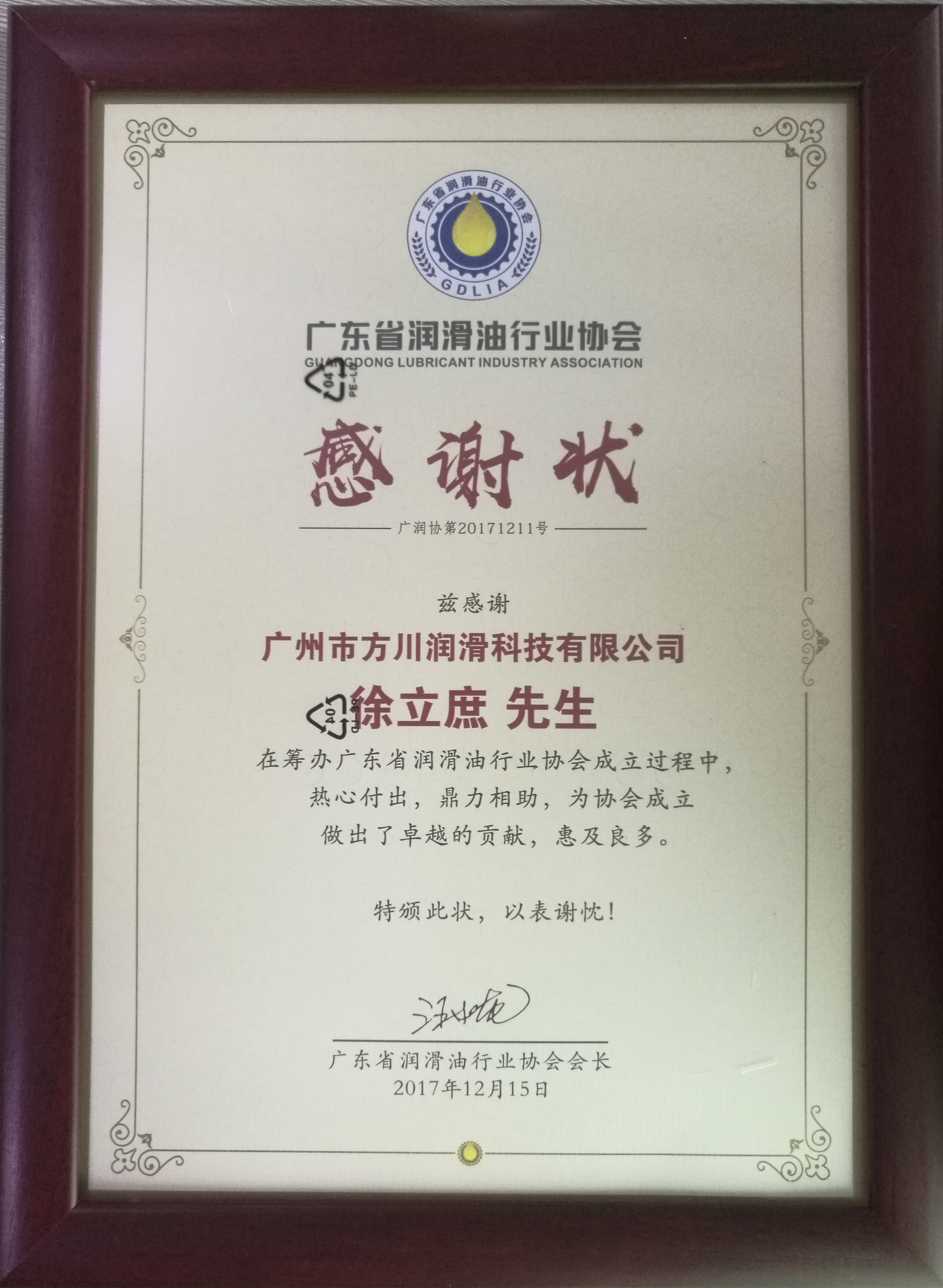 協(xié)會給我們公司總經(jīng)理徐立庶授匾“廣東省潤滑行業(yè)協(xié)會工業(yè)潤滑油委員會主任”,并頒發(fā)“感謝狀”感謝我們在協(xié)會成立過程中所作的貢獻。