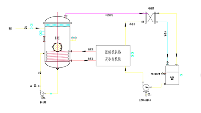蒸汽走向:氟利昂加熱介質(zhì)經(jīng)壓縮后給物料加熱,蒸發(fā)出來二次蒸汽進(jìn)入冷凝器冷凝。低溫氟利昂冷卻循環(huán)水,低溫循環(huán)水用于冷凝二次蒸汽。冷凝水進(jìn)入冷凝水儲(chǔ)罐,并溢流排放。